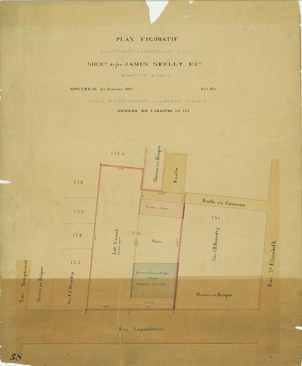 Ce plan présente le lot n° 132 du cadastre du quartier Saint-Louis de la cité de Montréal. Ce lot est situé sur la rue Lagauchetière, entre les rues Sanguinet et Sainte-Élizabeth à Montréal.Sont localisées sur le lot des maisons de deux étages en pierre et brique et des remises en brique. Les voisins sont les successions F. X. et J. B. Beaudry. Les mesures et la superficie du lot sont indiquées