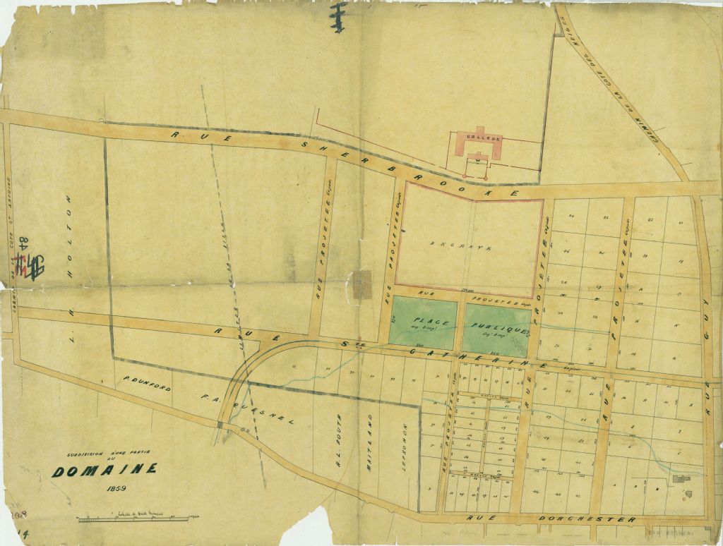 - Ce plan présente cette partie du Domaine des Prêtres située dans le quadrilatère formé par les rues Dorchester (devenue boulevard René-Lévesque), Guy, Sherbrooke et Côte Saint-Antoine à Montréal. Ce sont les lots n° 1592 à 1685 du cadastre du quartier Saint-Antoine de la cité de Montréal et les lots n° 375 à 380 du cadastre de la municipalité de la paroisse de Montréal.Cet emplacement est subdivisé en 81 lotissements. Sont localisés sur le plan l'emplacement du Séminaire de Montréal, un édifice situé devant le Séminaire, lequel édifice joint les deux tours sur la rue Sherbrooke. À l'intersection des rues Dorchester (devenue boulevard René-Lévesque) et Guy, se retrouve une résidence avec ses dépendances. Une place publique est prévue sur la rue Sainte-Catherine, vis-à-vis le Séminaire de Montréal. Les voisins sont Monsieur Leprohon, Monsieur Maitland, H. L. Routh, F. A. Quesnel, P. Durnford et L. H. Holton. Les mesures de plusieurs lotissements sont indiquées