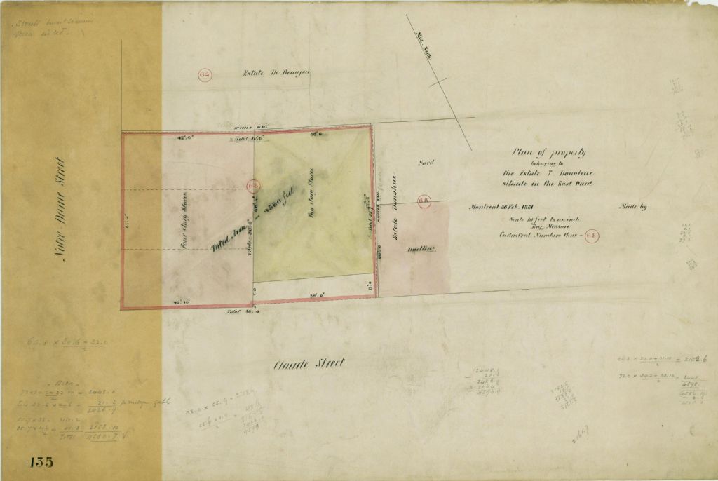 Ce plan présente une partie du lot n° 68 du cadastre du quartier Est de la cité de Montréal. Ce lot appartient à la succession de feu T. Donohue. Ce lot est situé à l'intersection des rues Notre-Dame et Claude (en réalité Saint-Claude) à Montréal.Sont localisés sur cette partie du lot un magasin de trois étages et un autre magasin de deux étages. Le voisin est la succession de Beaujeu. Les mesures et la superficie de cette partie du lot sont indiquées