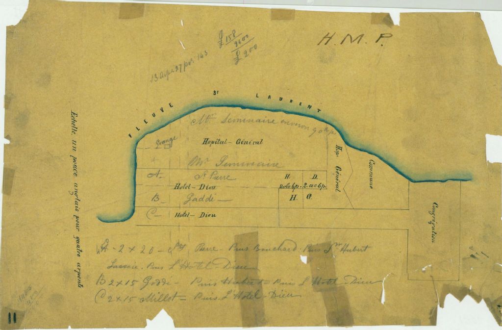 Ce plan présente les lots acquis par les Soeurs de l'Hôtel-Dieu. Ces lots sont situés à la Pointe Saint-Charles près du fleuve Saint-Laurent. Certains lots sont sur la rue de la Congrégation à Montréal. Ce sont en partie les lots n° 321 et 322 du cadastre du quartier Sainte-Anne de la cité de Montréal.Le plan présente les propriétaires successifs des lots concernés. Une grange est localisée près du fleuve. Les mesures de certaines partie d'un lot sont indiquées