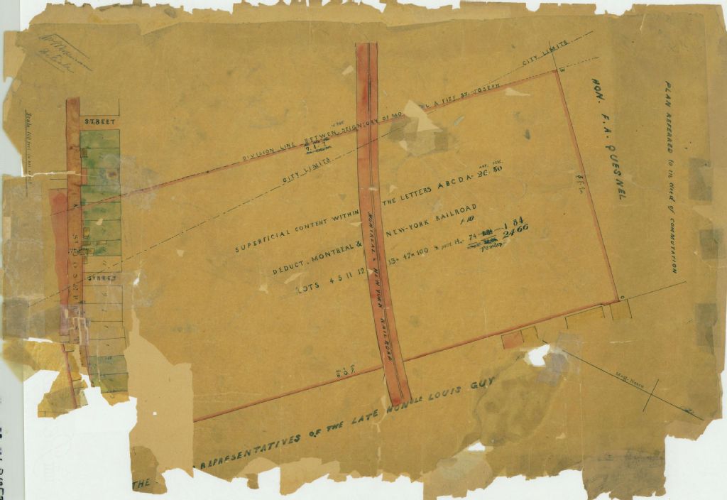 Ce plan présente la propriété appartenant à Messieurs Workman et Delisle. Cette propriété est située sur la rue Saint-Joseph (devenue Notre-Dame) à Montréal, près de la limite de la ville de Montréal. Il s'agit des lots n° 1 à 86 et 97 à 170 du cadastre du quartier Saint-Antoine de la cité de Montréal et les n° 433, 459 à 467, 499 à 518 et 545 à 560 du cadastre de la municipalité de la paroisse de Montréal. Le chemin de fer Montreal & New York Railways traverse la propriété. Les mesures de la propriété et les superficies de lots et de la voie du chemin de fer sont indiquées
