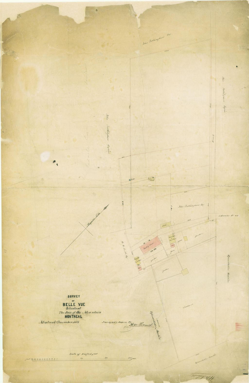 Ce plan présente la propriété connue sous le nom de Belle Vue, au bas de la montagne du Mont Royal à Montréal. Ce sont les lots n° 1822 à 1867 du cadastre du quartier Saint-Antoine de la cité de Montréal.Outre l'emplacement de la résidence, il y a une étable, un puits, deux remises à bois et à voitures pour chevaux dans le lot Belle Vue et une maison d'été, un puits et une étable sur un lot appartenant à monsieur John Frothingham. Les voisins sont John Frothingham, les représentants de Beaubien, de Masson et Beaubien et H. B. Smith. Un chemin traverse le lot de Monsieur Frothingham pour atteindre un autre chemin qui conduit à la rue Durocher et à la propriété Belle Vue. Diverses mesures sont indiquées