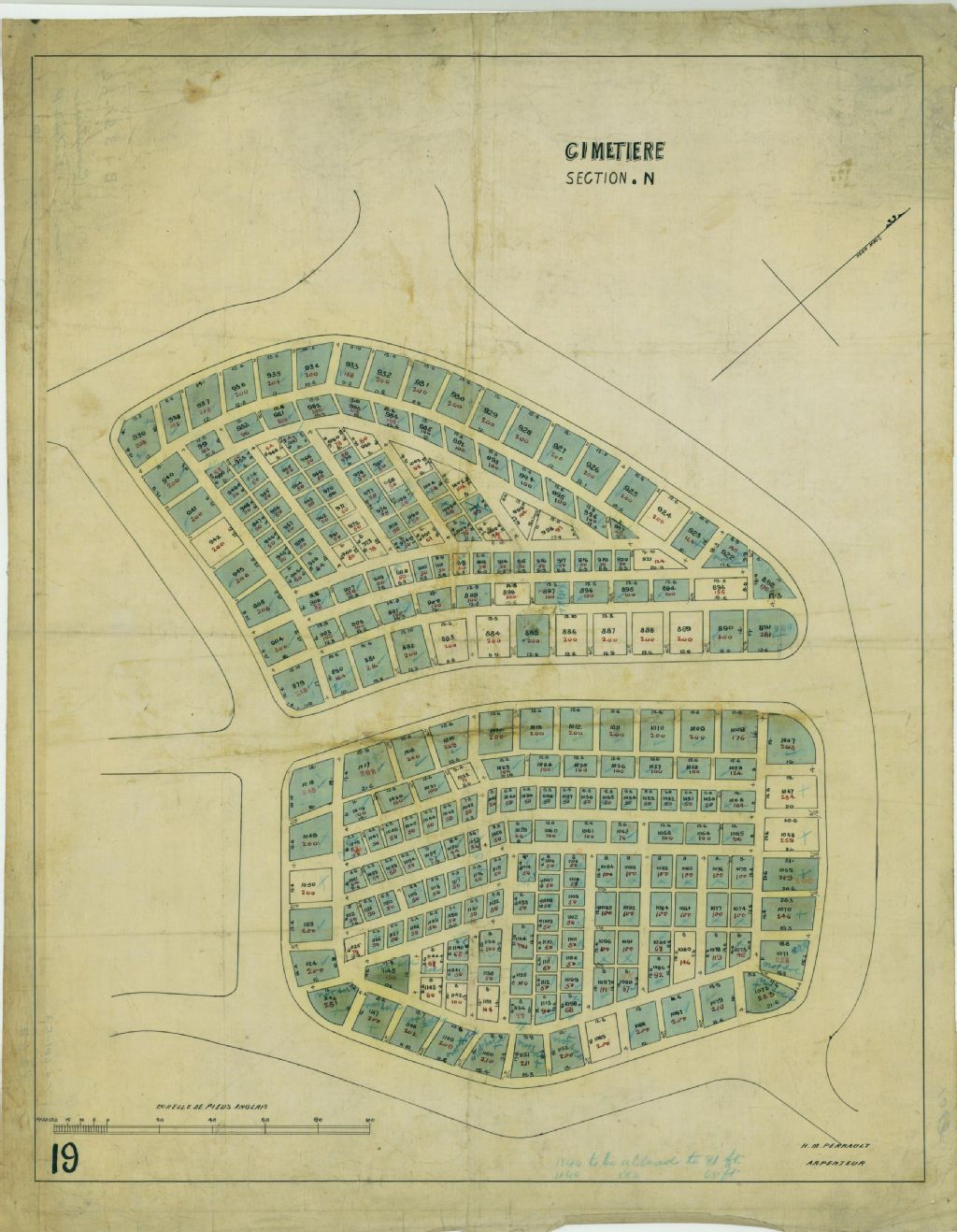 Cette section du cimetière Notre-Dame-des-Neiges est subdivisée en lots numérotés de 879 à 1152. Les mesures et les superficies des lots sont indiquées