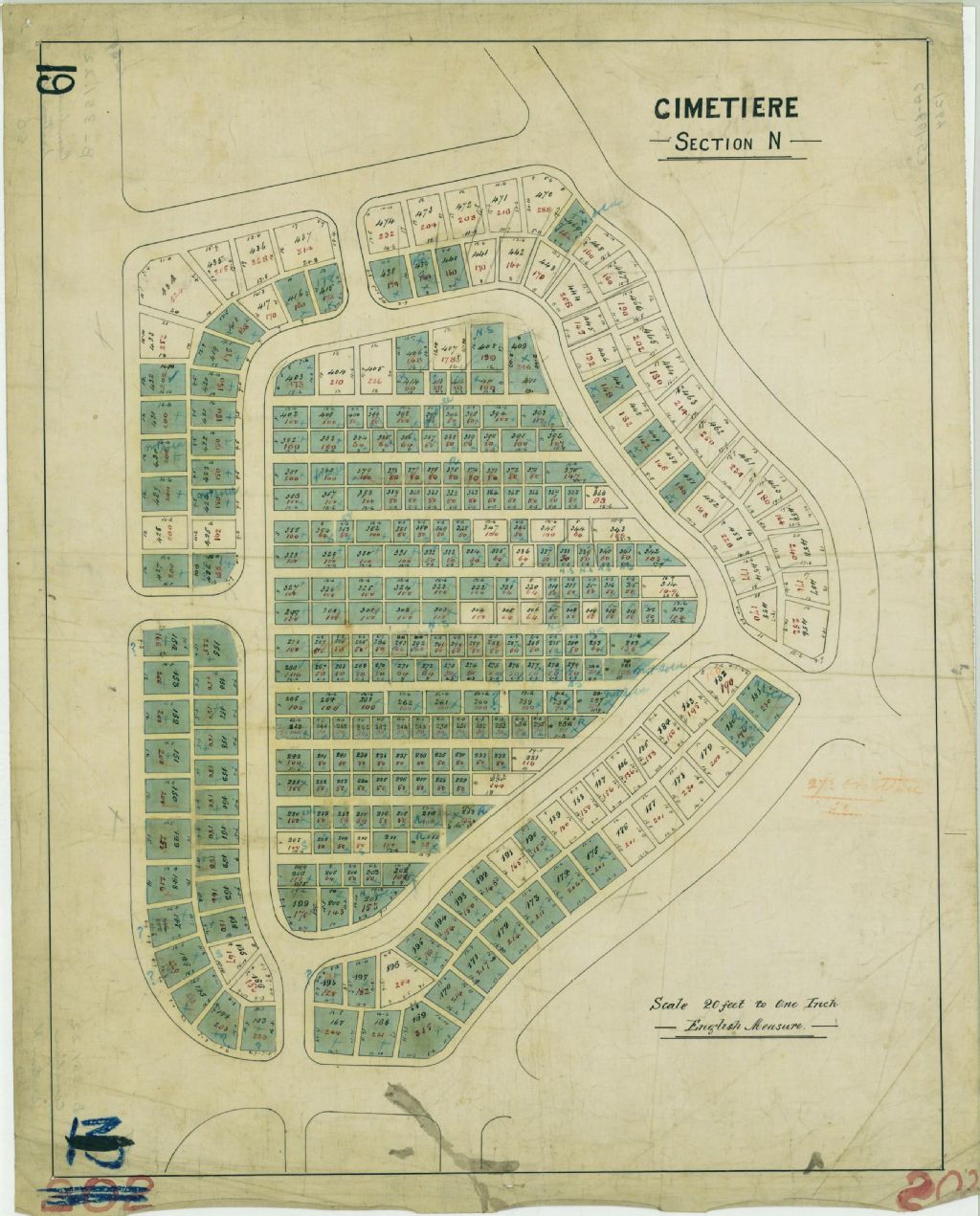 Cette section du cimetière Notre-Dame-des-Neiges est subdivisée en lots numérotés de 143 à 474. Les mesures et les superficies des lots sont indiquées