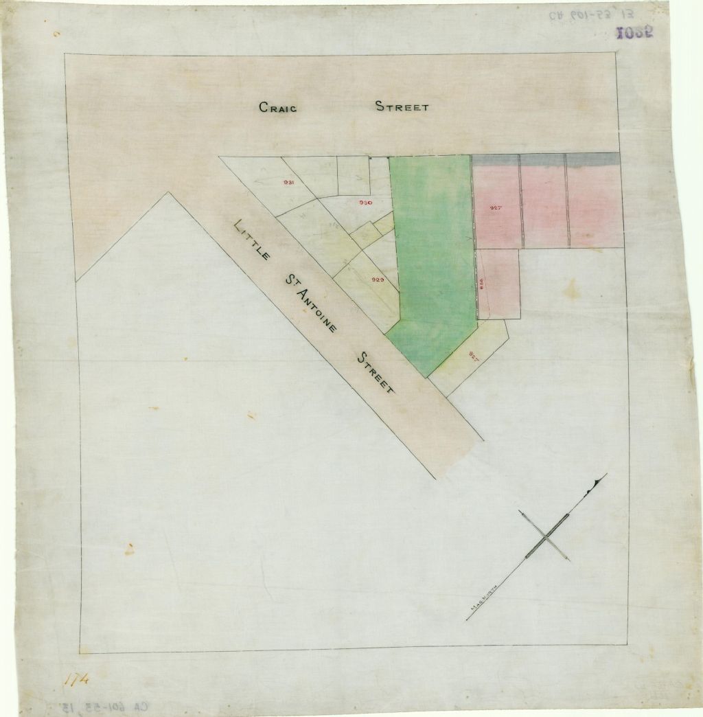 Croquis d'une propriété, sur le lot n° 927 du cadastre du quartier Saint-Antoine de la cité de Montréal, appartenant aux héritiers de William Murray. Cette propriété est située entre les rues Craig (devenue Saint-Antoine) et Saint-Antoine (devenue square Victoria)