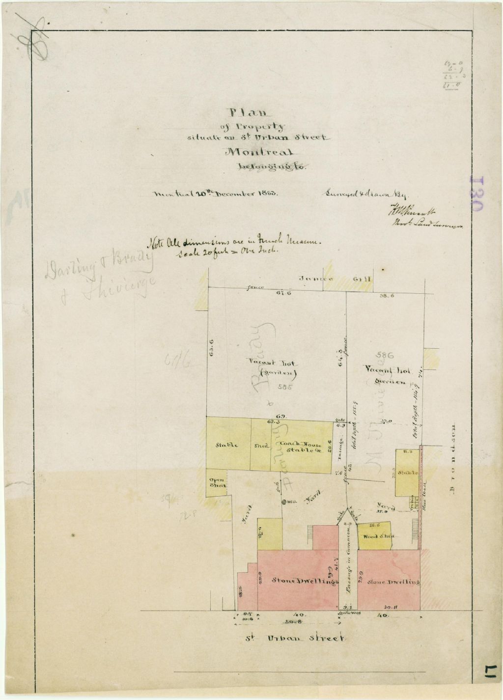 Ce plan indique une propriété située sur la rue Saint-Urbain à Montréal appartenant à Dowling & Brady et à monsieur M. Thivierge. Ce sont les lots n° 365 et 389 du cadastre du quartier Saint-Laurent de la cité de Montréal. Sur le lot de Monsieur Thivierge, il y la une maison en pierre, une remise à bois, une toilette extérieure, une étable et un jardin. Sur le lot de Dowling & Brady, il y a une maison en pierre, une remise ouverte, une remise, une étable et remise pour chariots à chevaux et un jardin. Les propriétaires voisins sont messieurs James Gill et Bronson