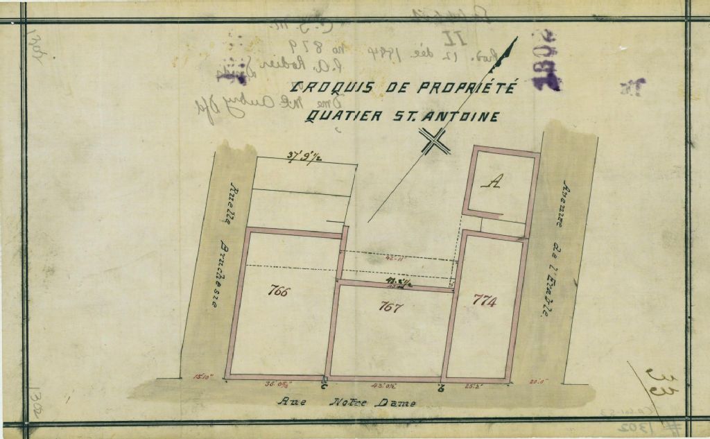 Ce plan présente les lots n° 766, 767 et 774 du cadastre du quartier Saint-Antoine de la cité de Montréal. Ces lots appartiennent à A. MacFarlane et J. Shayne. Ces terrains sont situés sur la rue Notre-Dame entre les rues de l'Érable (aussi appelée Maple mais aujourd'hui disparue) et la ruelle Bruchésie (aujourd'hui disparue) à Montréal.Ce plan a été produit comme exhibit à la Cour supérieure de Montréal dans la cause n° 879 entre P. A. Rodier et dame M. C. Aubry le 12 décembre 1884. Les mesures des lots sont indiquées