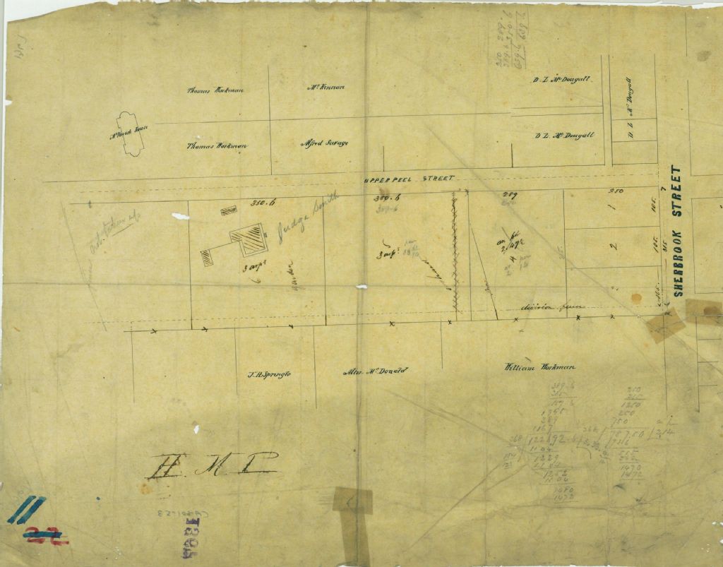 Ce plan présente la propriété appartenant au juge Smith. Il s'agit du lot n° 1760 du cadastre du quartier Saint-Antoine de la cité de Montréal.Sont localisées sur le lot une résidence et une remise. La maison McTavish se trouve de l'autre côté de la rue Peel. Les voisins sont William Workman, Alexander McDonald, J. H. Springle, Thomas Workman, Alfred Savage, Monsieur McKinnon et D. L. McDougall. Les mesures des lots sont indiquées