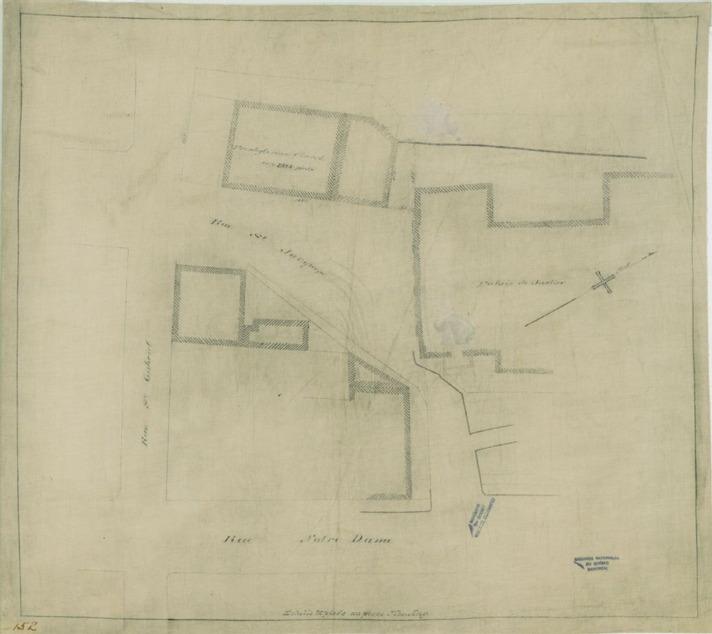 Ce plan présente le triangle formé par les rues Saint-Jacques, Notre-Dame et Saint-Gabriel à Montréal. Il s'agit des lots n° 118 à 123 du quartier Est de la cité de Montréal.L'emplacement des édifices existants est précisé. Il s'y trouve l'Église presbytérienne et le Palais de Justice. Le plan donne le nouveau tracé de la rue Saint-Jacques vers la rue Notre-Dame