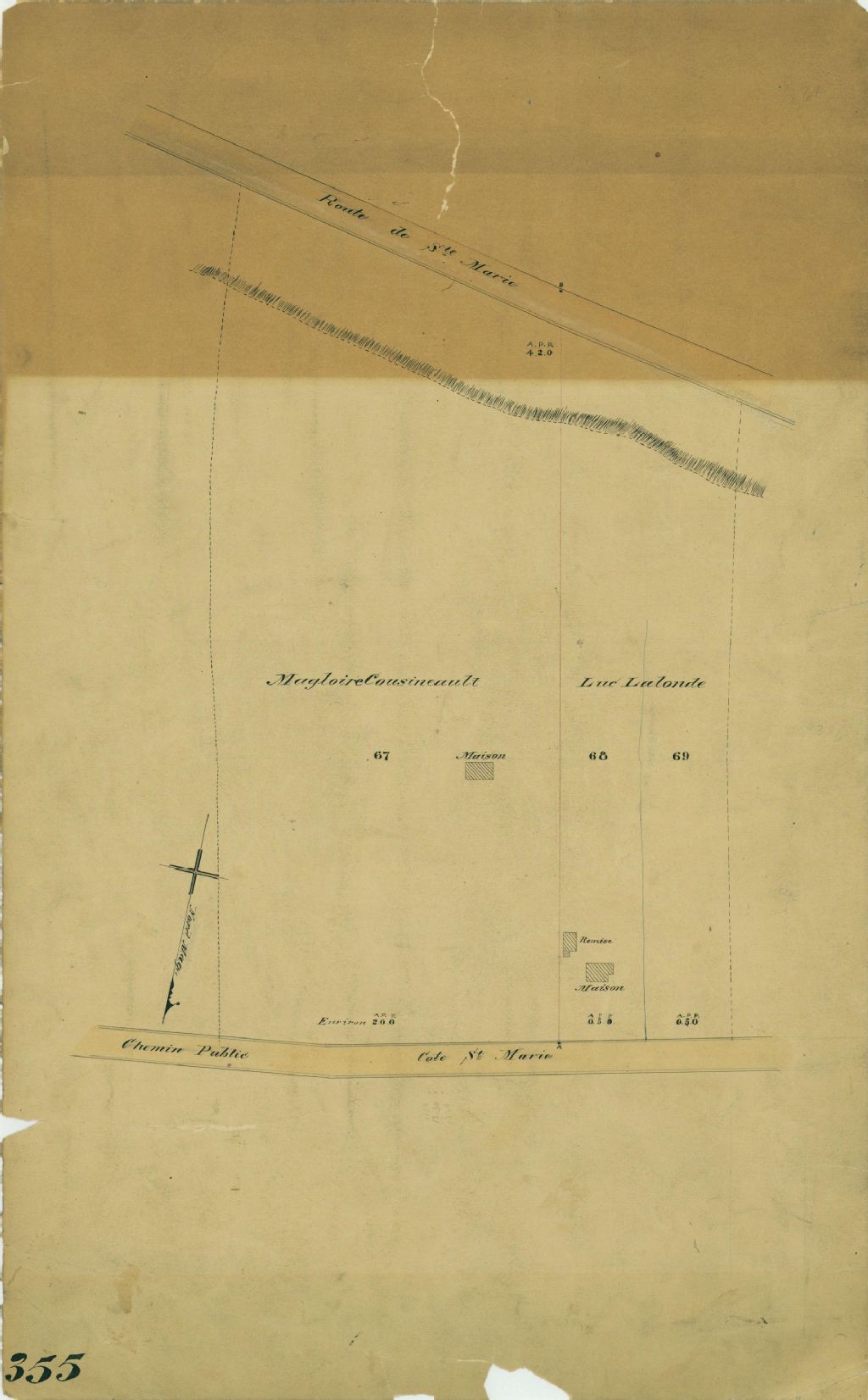 Ce plan présente les propriétés appartenant à messieurs Magloire Cousineau et Luc Lalonde. Ces propriétés sont situées entre la Côte Sainte-Marie et la Route de Sainte-Marie à Sainte-Anne-de-Bellevue. Ce sont les lots n° 67 à 69 du cadastre de la paroisse de Sainte-Anne sur l'île de Montréal.Sont localisées sur le lot n° 67 une maison et sur le lot n° 68 une maison et une remise. Les superficies des lots sont indiquées