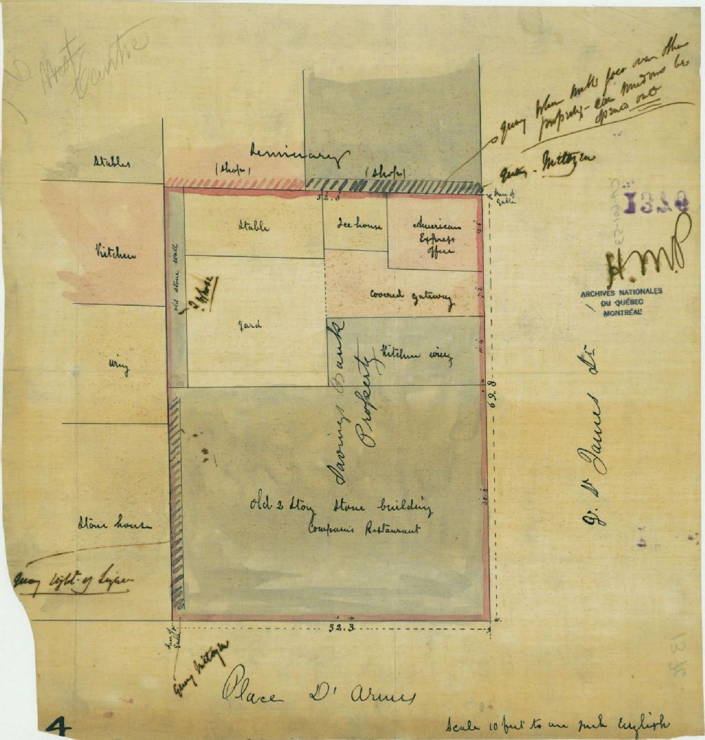 Ce plan présente l'emplacement de la Savings Bank à l'intersection de la rue Saint-Jacques et de la Place d'Armes à Montréal. Il s'agit du lot n° 156 du cadastre du quartier Centre de la cité de Montréal.Sont localisés sur le lot un édifice de deux étages en pierre comprenant le restaurant de la banque, une cuisine attenante, une entrée couverte donnant sur la cour intérieure, le bureau de l'American Express, une glacière et une étable. Le voisin est le Séminaire de Montréal. Les mesures du lot sont indiquées