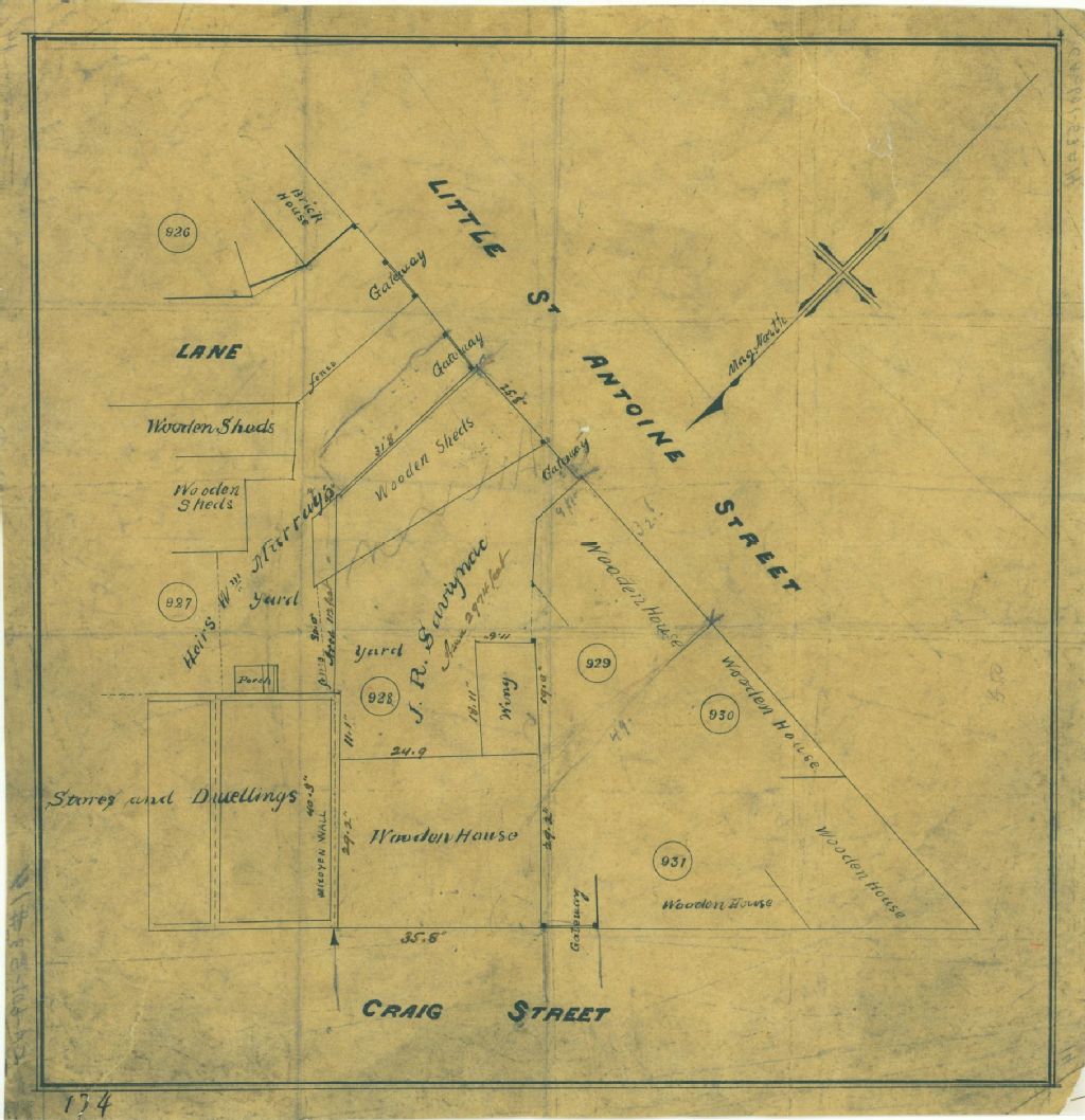 Croquis d'une propriété, sur les lots n° 927 à 931 du cadastre du quartier Saint-Antoine de la cité de Montréal. La propriété de la succession de William Murray est spécifiquement marquée sur le plan. Cette propriété est située entre les rues Craig (devenue Saint-Antoine) et Saint-Antoine (devenue square Victoria). Le plan indique également l'emplacement de maisons, de hangars, d'un magasin, d'habitations et des terrains appartenant à J. R. Savignac avec ses maisons et dépendances. Les mesures des lots sont indiquées
