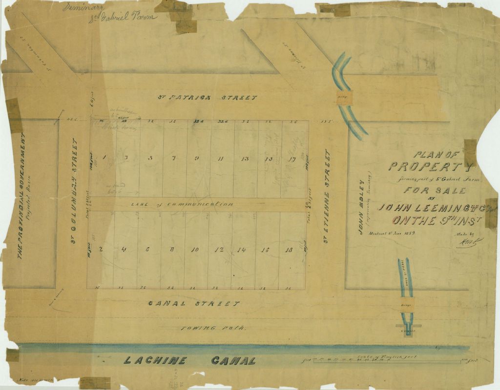 Ce plan présente des lots formant une partie de la ferme Saint-Gabriel. Ces lots sont compris dans le quadrilatère formé par les rues du Canal (disparue depuis), Saint-Colomban, Saint-Patrick et Saint-Étienne (devenue Bridge) à Montréal. Il s'agit des lots n° 582 à 599 du cadastre du quartier Sainte-Anne de la cité de Montréal. La rivière Saint-Pierre passe près de ces lots. Les mesures des lots sont indiquées