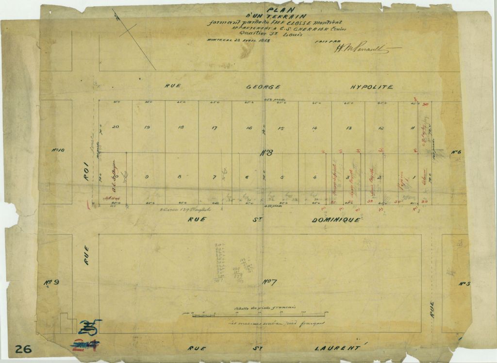 Ce plan présente le terrain compris entre les rues Georges-Hypolite (devenue avenue Coloniale), Roy et Saint-Dominique à Montréal. Il s'agit d'une partie du lot n° 1049 du cadastre du quartier Saint-Louis de la cité de Montréal.Cette partie du lot est subdivisée en 20 lotissements dont certains sont déjà vendus. Les nouveaux propriétaires sont A. E. S. Augé, B. F. Ingley, Monsieur Pépin, Monsieur Lebrun, Louis et Isidore Payette et Prospère Lapointe. Les mesures des lotissements sont indiquées