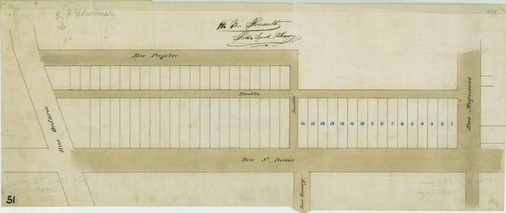 Ce plan présente les terrains situés dans le quadrilatère formé par les rues Saint-Denis, Ontario, Mignonne et une rue projetée (jamais construite) à Montréal. Il s'agit des lots n° 823 à 838 et une partie du lot n° 839 du quartier Saint-Jacques de la cité de Montréal. Les lots sont subdivisés en lotissements