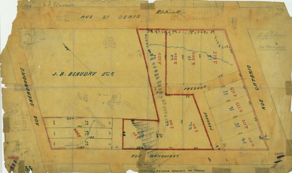 Ce plan présente la propriété située dans le quadrilatère formé par les rues Sherbrooke, Saint-Denis, Ontario et Sanguinet à Montréal. Il s'agit des lots n° 745 et 746 du cadastre du quartier Saint-Louis de la cité de Montréal.Une partie de la propriété appartient à J. B. Beaudry. Le reste est subdivisé en lotissements numérotés de 14 à 27. La valeur monétaire des lots est indiquée en Livres sterling. Les mesures des lotissements sont indiquées