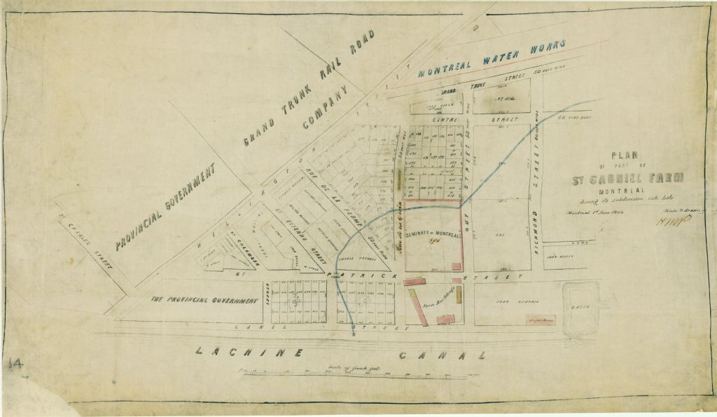 - Ce plan de la ferme Saint-Gabriel à Montréal présente une partie de la Pointe Saint-Charles dans le quadrilatère formé par le Canal Lachine, les rues Wellington, Grand Trunk et Richmond. Ce sont les lots n° 591 à 816 et 891 à 997 du cadastre du quartier Sainte-Anne de la cité de Montréal. Un ruisseau traverse le quadrilatère. La rue Richardson est localisée sans être identifiée.Le Séminaire de Montréal possède des édifices de ferme de part et d'autre de la rue Saint-Patrick depuis la rue du Canal et entre les rues Guy (devenue Montmorency) et de la Croix (devenue Condé). Le seul autre édifice identifié est la sucrerie de John Redpath sur la rue du Canal près du bassin Redpath.Outre le gouvernement provincial et la compagnie du chemin de fer du Grand Tronc, les principaux propriétaires de lots nommés sont John Ostell, Francis Mullins, Thomas Louis, J. Flanery, Amable Prévost, Michael Meighan, Patrick Brennan ainsi qu'Edouard Farley. Les mesures et la numérotation des lots sont indiquées