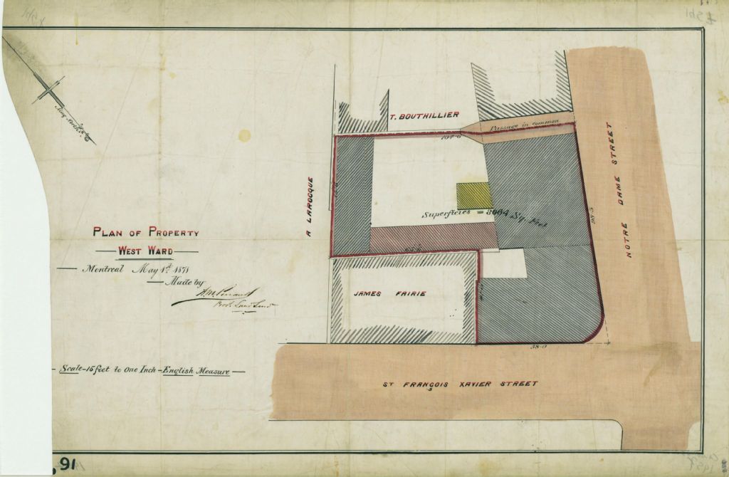 Ce plan présente la propriété située à l'intersection des rues Saint-François-Xavier et Notre-Dame à Montréal. Il s'agit d'une partie du lot n° 98 du quartier Ouest de la cité de Montréal. Ce lot appartient à Monsieur Cuvillier.Sont localisés sur la partie du lot des édifices et une remise. Les voisins sont James Fairie, A. Larocque et T. Bouthillier. Les mesures et la superficie de cette partie du lot sont indiquées