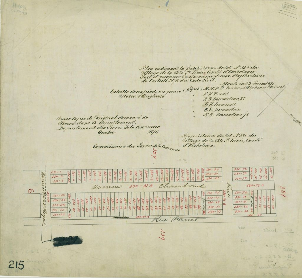 Plan indiquant la subdivision du lot no 330 du village de la Côte St Louis Comté d'Hochelaga. Fait et préparé conformement aux dispositions de l'article 2175 du Code Civil
