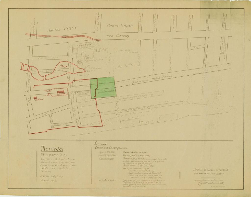 Ce plan présente, sur un fond de carte moderne (1948), les anciennes fortifications et les anciennes rues de la partie est de la ville de Montréal. Ce plan montre les rues comprises entre les rues des Commissionners (devenue de la Commune), de la Friponne, Bonsecours, Craig (devenue Saint-Antoine) et Beaudry à Montréal.Sont localisés du Montréal disparu : les fortifications, l'étang, la rivière Saint-Martin, le Square Dalhousie, la Citadelle, la citerne et l'office de l'Ordonnance. Les noms et l'emplacement des anciennes rues, souvent disparues, sont aussi indiquées. L'Hôtel et la gare Viger, la pesée ainsi que la gare Dalhousie sont localisés. Une légende explique les lignes et les couleurs du plan. De plus cette légende indique que les auteurs ont utilisé le plan des fortifications produit par Louis Charland en 1803