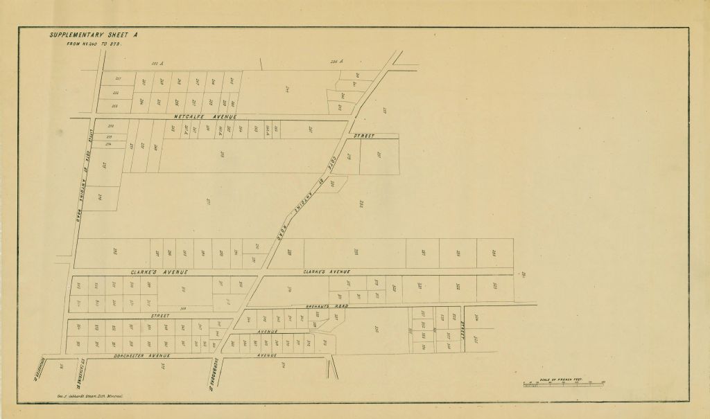 Ce plan présente le cadastre officiel comprenant les lots n° 240 à 373 du cadastre de la municipalité de la paroisse de Montréal. Ces lots sont compris entre les rues Petit chemin Côte-Saint-Antoine (devenu Sainte-Catherine) Metcalfe, Côte-Saint-Antoine et Dorchester (devenue Wood) à Westmount