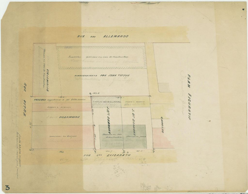 Ce plan présente les lots situés sur la rue Vitré, entre les rues Sainte-Élizabeth et des Allemands (devenue avenue de l'Hôtel-de-ville) à Montréal. Il s'agit des lots n° 124 à 126 du cadastre du quartier Saint-Louis de la cité de Montréal.Sont localisés sur les lots : des maisons en brique avec remises et écuries en brique sur le lot de Louis Villemaire; une maison en pierre avec écurie et remise ainsi qu'une maison, une écurie et remise en voie de construction sur le lot de J. Bte. Beaudry; des maisons en voie de construction sur un lot de Louis Villemaire et sur celui de feu John Tiffin. Le voisin est un Monsieur Charles. Les mesures des lots sont indiquées