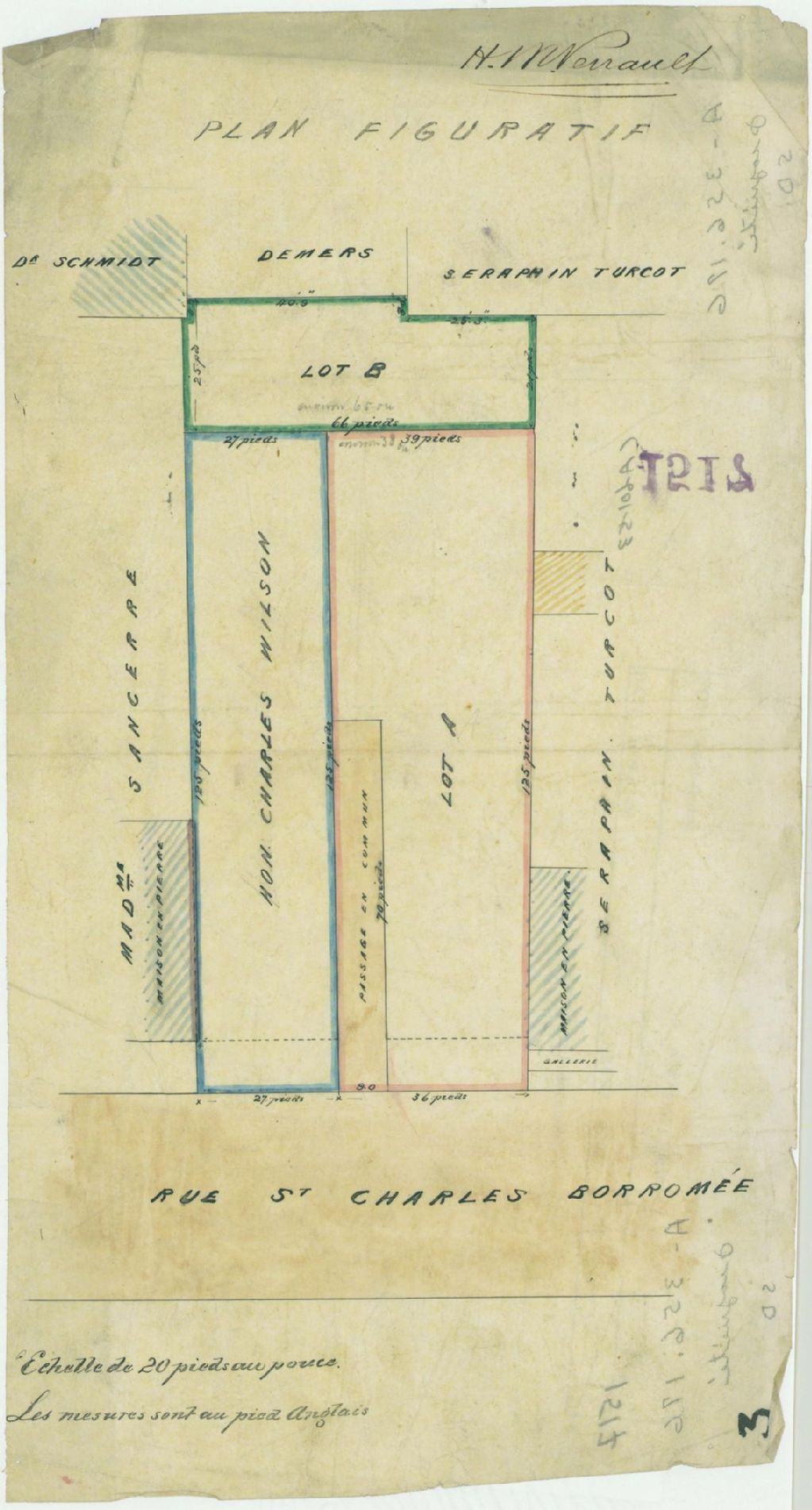 Ce plan présente le lot appartenant à l'honorable Charles Wilson. Ce lot est situé sur la rue Saint-Charles-Borromée (devenue rue Clark) près de la rue Saint-Antoine à Montréal. Il s'agit du lot n° 812 du cadastre du quartier Saint-Laurent de la cité de Montréal.Le terrain est subdivisé en trois lots. Les voisins sont Madame Sancerre, le Docteur Schmidt, Monsieur Demers et Séraphin Turcot. Les mesures du lot sont indiquées