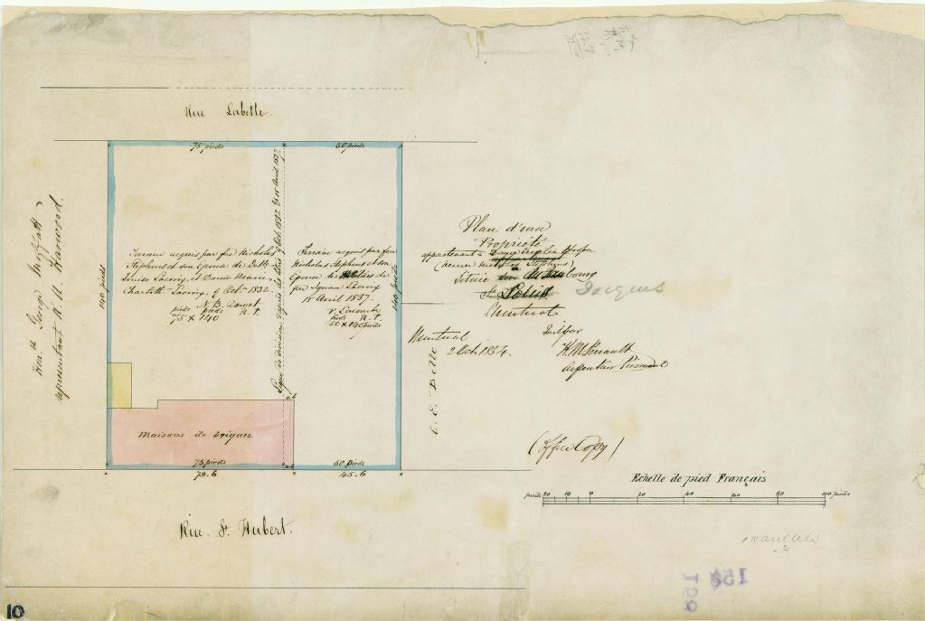Ce plan représente le terrain appartenant à madame Émilia Hooper, veuve de Nicholas Stephens. Ce terrain se trouve entre les rues Saint-Hubert et Labelle à Montréal. C'est le lot n° 492 du cadastre du quartier Saint-Jacques de la cité de Montréal. Une maison en brique est localisée sur le plan. Le lot était divisé en deux parties lorsque Nicholas Stephens les a acquis en 1832 et 1837 pour n'en faire qu'un seul. Les voisins sont George Moffatt représentant R. N. Harwood et C. E. Belle. Les dimensions du lot sont indiquées