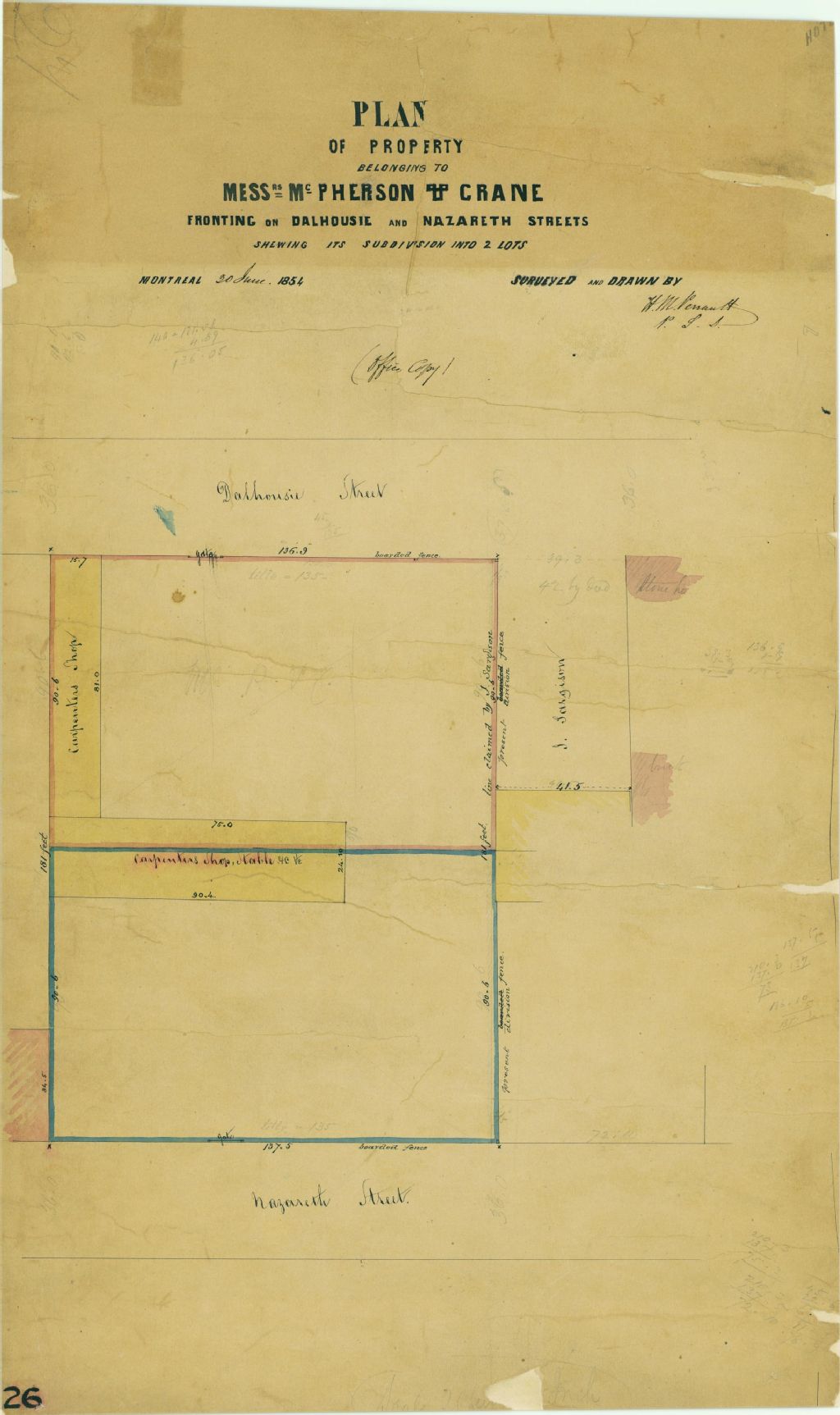 Plan of Property Belonging to Messrs Mc Pherson & Crane Fronting on Dalhousie and Nazareth Streets Shewing its Subdivision into 2 lots