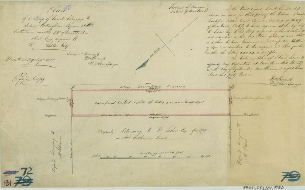 Plan of a Strip of Land Belonging to Sidney Bellingham Esquire at Ste-Catherines Near the City of Montreal About Being Acquired by P. Leslie Esq