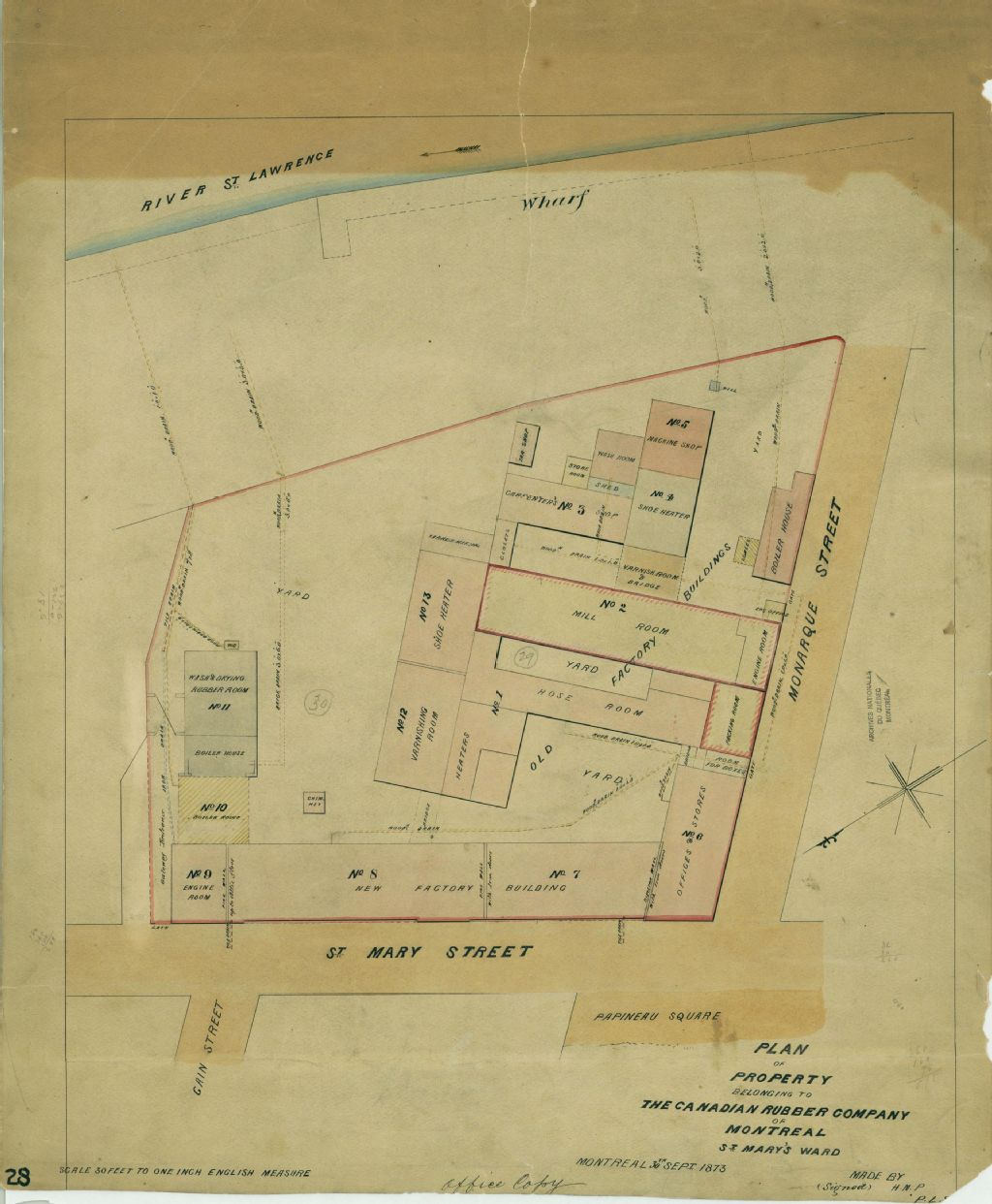 Ce plan présente les lots n° 29 et 30 du cadastre du quartier Sainte-Marie de la cité de Montréal. Ces lots appartiennent à la Canadian Rubber Company. Ils sont situés à l'intersection des rues Sainte-Marie (devenue Notre-Dame) et Monarque (devenue Papineau) à Montréal près du fleuve Saint-Laurent.Sont localisés sur le plan les anciens et les nouveaux édifices industriels de la compagnie. Outre l'édifice à bureaux, nous retrouvons aussi : les ateliers pour les souliers, pour les boyaux, pour laver et faire sécher le cuir et pour le vernissage; trois salles des chaudières; une salle d'expédition. Le nouvel entrepôt aura trois portes coupe-feu en fer. Les drains tant en bois, en tuiles, en étain et en fer sont aussi localisés sur le lot ainsi que le puits et les toilettes