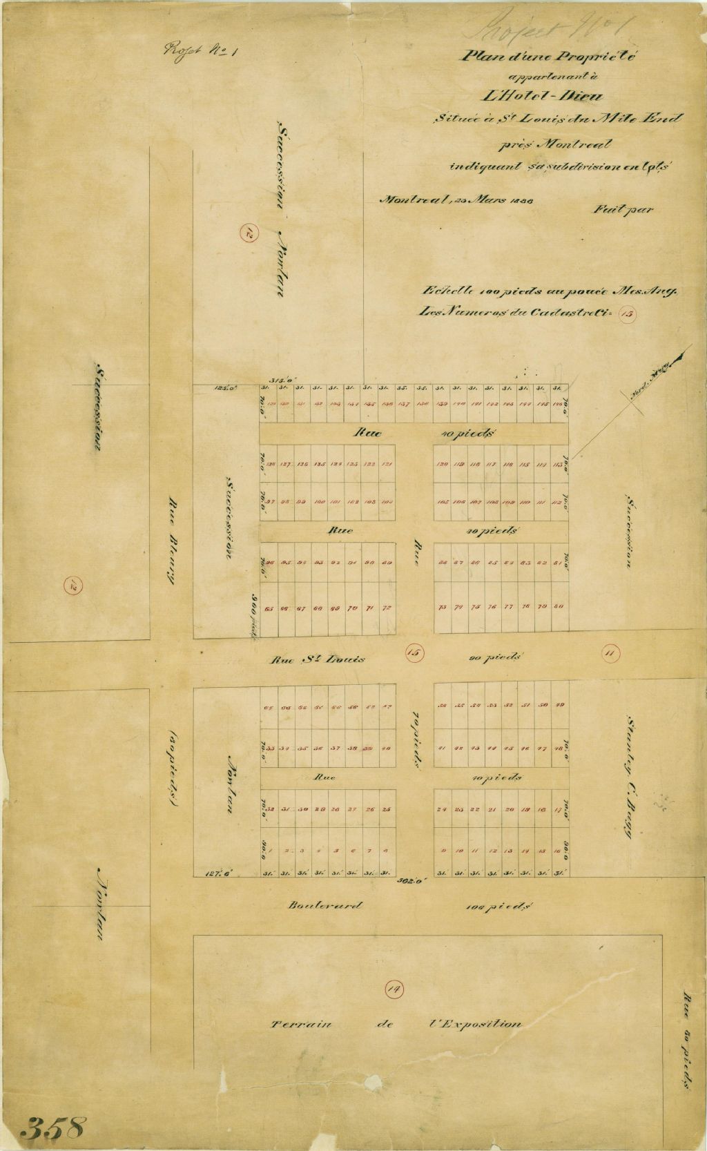 Plan d'une propriété appartenant à l'Hôtel-Dieu située à St-Louis du Mile End près Montréal indiquant sa subdivision en lots