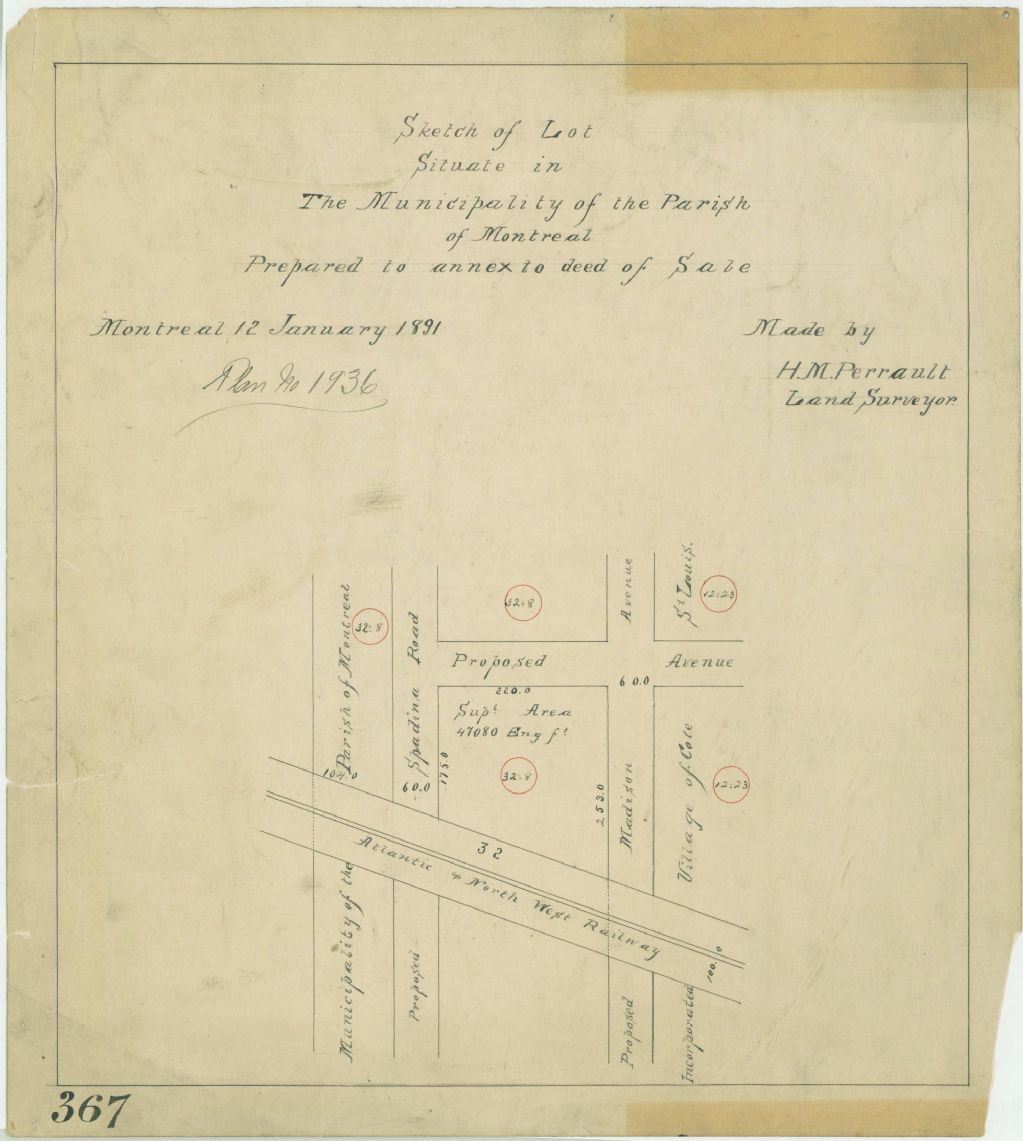 Ce plan présente les parties des lots n° 12 du cadastre du village de Côte-Saint-Louis et n° 32 du cadastre de la municipalité de la paroisse de Montréal. Ces lots sont situés près de la ligne de chemin de fer Atlantic & North West de part et d'autre de la rue Madison (devenue Hutchison) et près d'une rue proposée (qui deviendra Atlantic) à Montréal. Les mesures et la superficie d'une subdivision du lot n° 32 sont indiquées