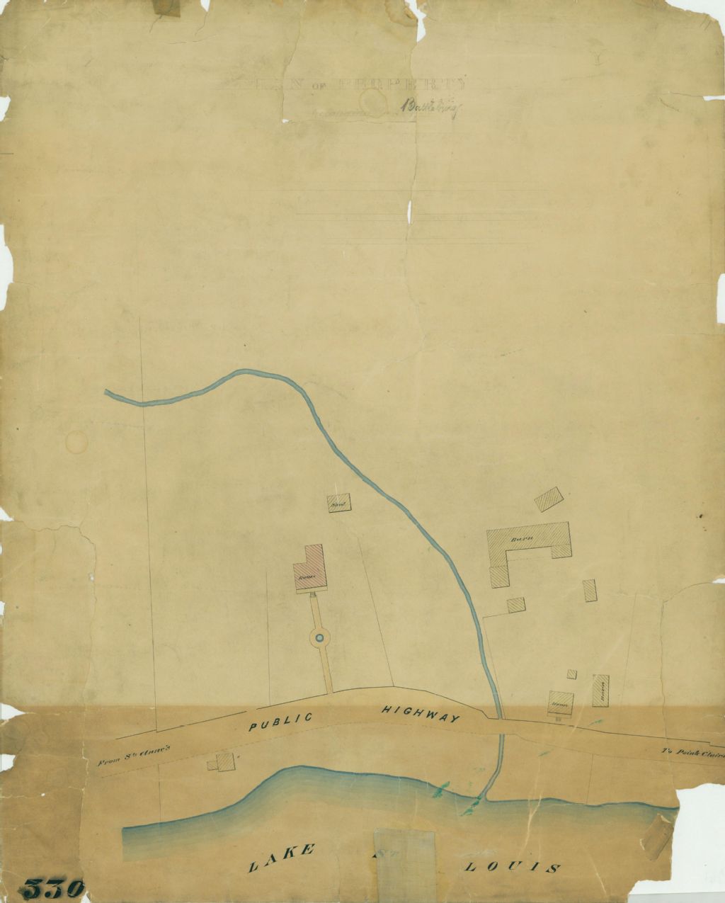 Ce plan présente la propriété de Monsieur Battlebury dans la paroisse de la Pointe-Claire sur l'île de Montréal. Le lot est situé sur le chemin public (devenu Lakeshore Road) entre Sainte-Anne-de-Bellevue et Pointe-Claire.Sont localisées sur le lot deux résidences, deux granges, une remise et quelques autres édifices. Un ruisseau traverse la propriété