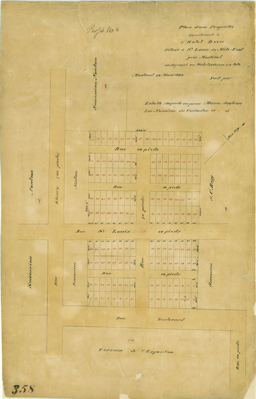 Plan d'une propriété appartenant à l'Hôtel-Dieu située à St-Louis du Mile End près Montréal indiquant sa subdivision en lots