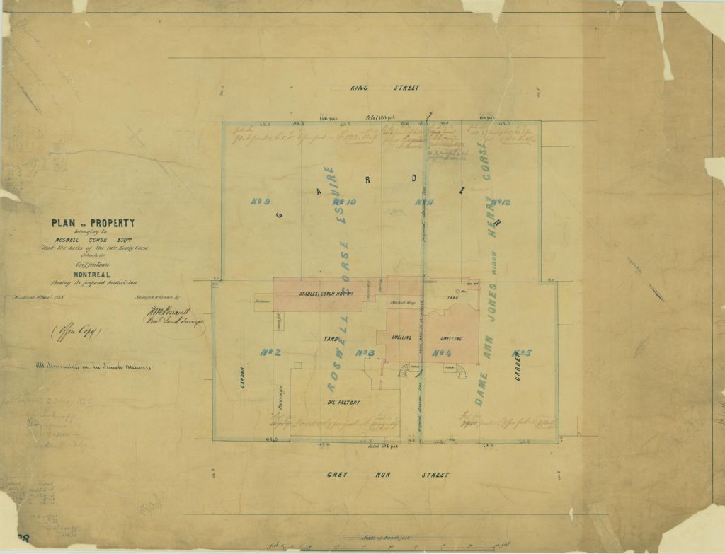 Ce plan représente le terrain de la succession de feu Henry Corse et appartenant à Roswell Corse. Il est situé dans Griffintown, entre les rues King et des Soeurs Grises à Montréal. Ce sont le lots n° 1586 à 1593 du cadastres du quartier Sainte-Anne de la cité de Montréal. Une manufacture d'huile, une résidence, une étable avec remise à calèches, un trou pour le crottin, une serre et un jardin sont localisés sur le lot de Roswell Corse. Dame Ann Jones, veuve de Henry Corse, possède la résidence, un puits et une fosse à cendres sur un autre lot. Les lots donnant sur la rue King ne sont pas construits. Les mesures et superficies des lots sont indiquées
