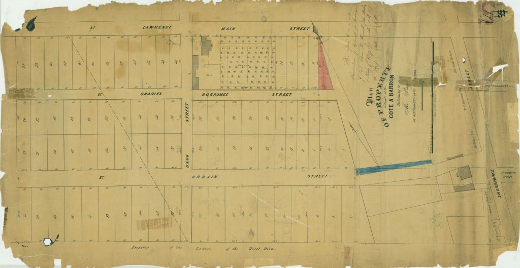 Ce plan présente une partie des terrains appartenant à S. C. Bagg. Ces lots sont situés dans le quadrilatère formé par les rues Saint-Laurent, la future rue Milton, au-delà de Saint-Urbain et l'Avenue des Pins à Montréal. Il s'agit des lots n° 19 à 28 et 101 à 118 du cadastre du quartier Saint-Laurent de la cité de Montréal.Une note indique que ce plan a servi pour un échange de parties de lots entre S. C. Bagg et John Molson. Les lots sont subdivisés en lotissements. Les voisins sont les Soeurs de l'Hôtel-Dieu, A. Voyer, Andrew Shaw, Monsieur McKenzie, W. C. Meredith et John Molson. Une maison et ses dépendances sont localisées sur la rue Bagg (devenue Prince-Arthur) entre les rues Saint-Laurent et Saint-Charles-Borromée (devenue Clark) à Montréal. Les mesures des lotissements sont indiquées