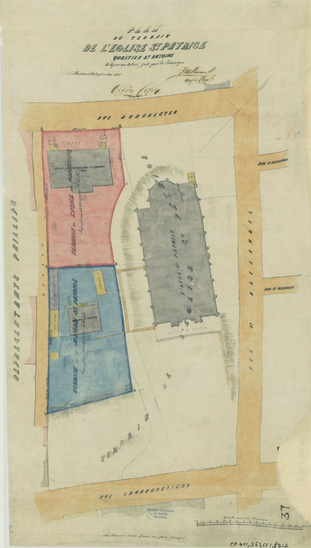 Ce plan détaille la localisation de l'église Saint-Patrice sur la rue Saint-Alexandre, entre les rues Lagauchetière et Dorchester (devenue René-Lévesque) à Montréal. C'est le lot n° 1160 du cadastre du quartier Saint-Antoine de la cité de Montréal. Outre l'église, sont localisés sur le lot, la Maison Saint-Patrice avec deux remises et une écurie ainsi que l'Asile des orphelins Saint-Patrice. Les mesures des terrains occupés par la Maison et l'Asile sont indiquées