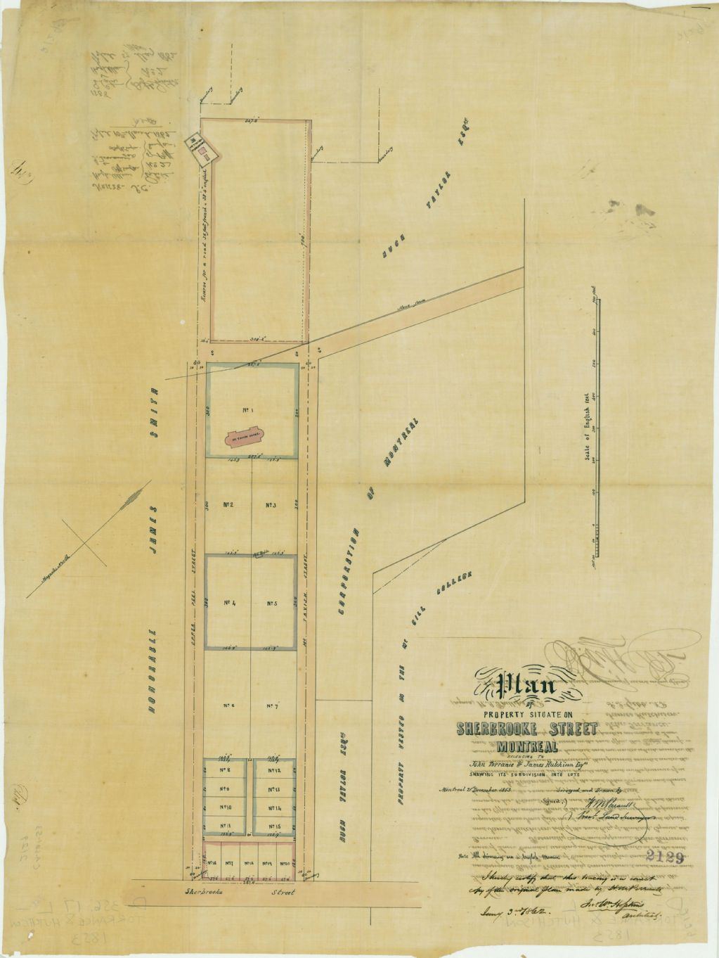 Plan of Property Situate on Sherbrooke Street Montreal Belonging to John Torrance and James Hutchison Esqrs Shewing its Subdivision into Lots