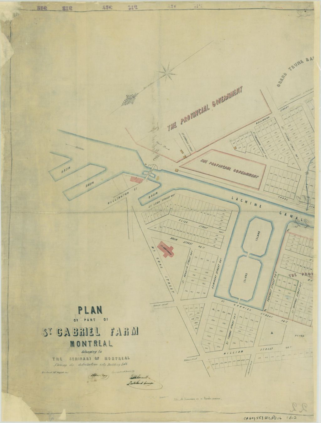 - Ce plan représente une partie de la ferme Saint-Gabriel à Montréal subdivisée en lots pour en permettre le développement urbain. Ce sont les lots n° 551 à 1414 du cadastre du quartier Sainte-Anne de la cité de Montréal. La partie de la ferme est comprise dans le quadrilatère formée par les rues Wellington, Grand Tronc, les limites de la ville de Montréal à la rue Guy, le Canal Lachine et encore les rues William et McCord (devenue de la Montagne).Les édifices identifiés sont l'église Sainte-Anne à l'intersection des rues du Bassin et McCord (devenue de la Montagne), les édifices de la ferme à cheval sur la rue Saint-Patrick entre les rues de la Croix (devenue de Condé), Richmond et du Canal (aujourd'hui inexistante) et enfin l'usine de sucre de John Redpath. Le long du Canal Lachine, il y a un édifice non identifié au pont de la rue Wellington, le bassin Ostell ainsi qu'une écluse près de la rue des Seigneurs. Le gouvernement provincial a retenu un quadrilatère de lots entre le Canal Lachine et les rues Richmond, William, Saint-Gabriel et de l'Aqueduc. Ce même gouvernement possède déjà les terrains situés de part et d'autre de la rue Wellington jusqu'à la rue Saint-Patrick, la compagnie de chemin de fer du Grand Tronc possède les terrains sur la rue Wellington à l'ouest des terrains du gouvernement et enfin la St. Gabriel Hydraulic Company possède des lots situés de part et d'autre du Canal Lachine dans le quadrilatère de forme irrégulière contenu entre les rues Saint-Patrick, Guy, William, des Seigneurs, du Bassin et Richmond. Ce plan sera utilisé lors de la transaction n° 3885 passé devant le notaire D. E. Papineau le 7 juillet 1856