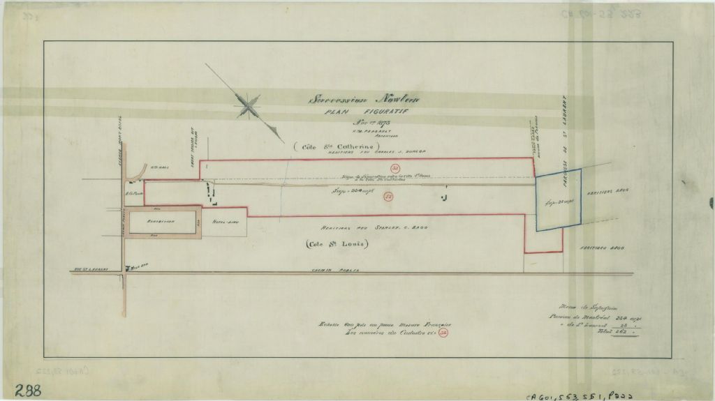 Ce plan représente un terrain appartenant à la succession Nowlan. Ce terrain est situé près de l'avenue Mont-Royal et des terrains de l'Exhibition à Montréal. Ce sont les lots n° 12 à 14 du cadastre du village de la Côte-Saint-Louis et les n° 29 à 32 du cadastre de la municipalité de la paroisse de Montréal. Le lot va jusqu'au trait carré de la limite de la paroisse de Saint-Laurent. Des édifices sont localisés sur le lot de la succession Nowlan. Le terrain de l'Exhibition est aussi localisé. Les voisins sont les héritiers de feu Charles J. Dunlop, de feu Stanley C. Bagg, de monsieur E. J. Penny et de Madame Hall. Un édifice indique le Mile End à l'intersection de l'avenue du Mont-Royal et le boulevard Saint-Laurent