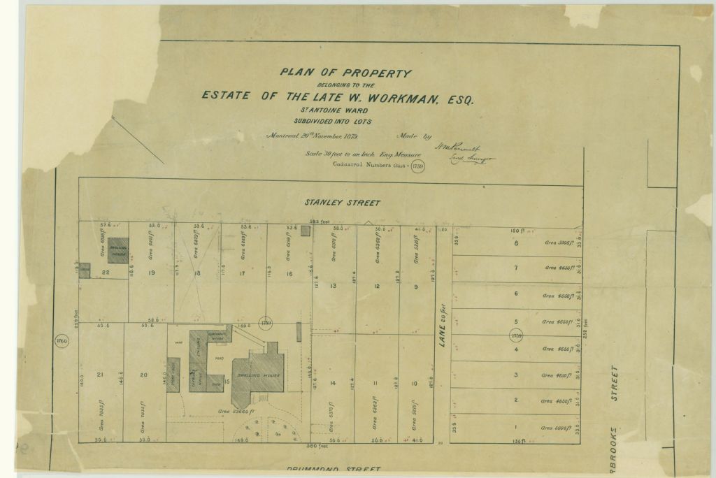 - Ce plan présente les lots appartenant à la succession W. Workman. Ces lots sont situés au nord de la rue Sherbrooke entre les rues Stanley et Redpath à Montréal. Ce sont les lots n° 1758 et 1759 du cadastre du quartier Saint-Antoine de la cité de Montréal. Sont localisées sur la rue Drummond : une résidence, une étable et deux remises; sur la rue Stanley : une autre résidence et une étable sur ce même lot. Le voisin immédiat est la succession de David Torrance. Les mesures et les superficies des lots sont indiquées