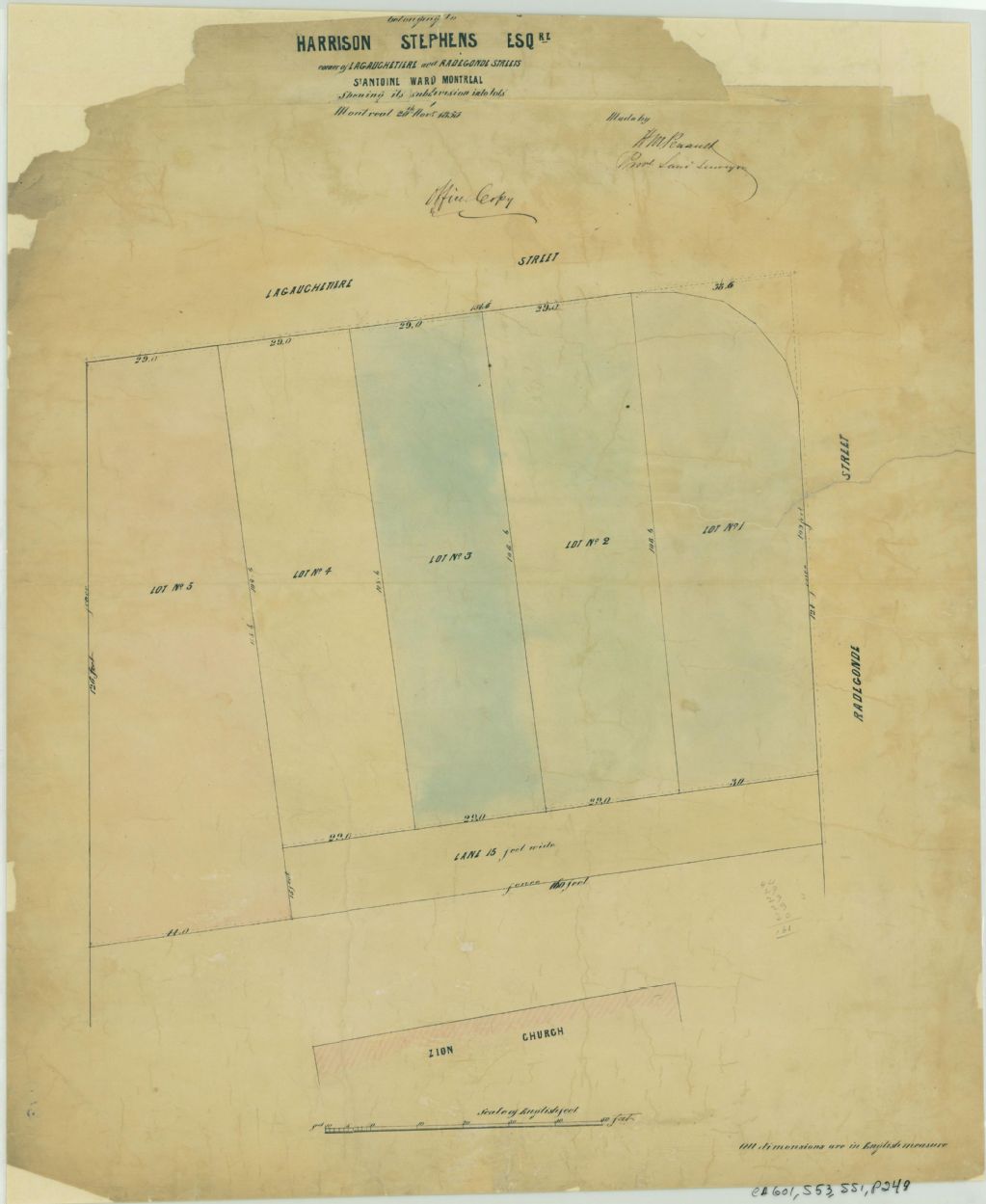 [Plan of Property] Belonging to Harrison Stephens Esqre. Corner of Lagauchetiere and Radegonde Streets St. Antoine Ward Montreal Shewing its Subdivision into Lots
