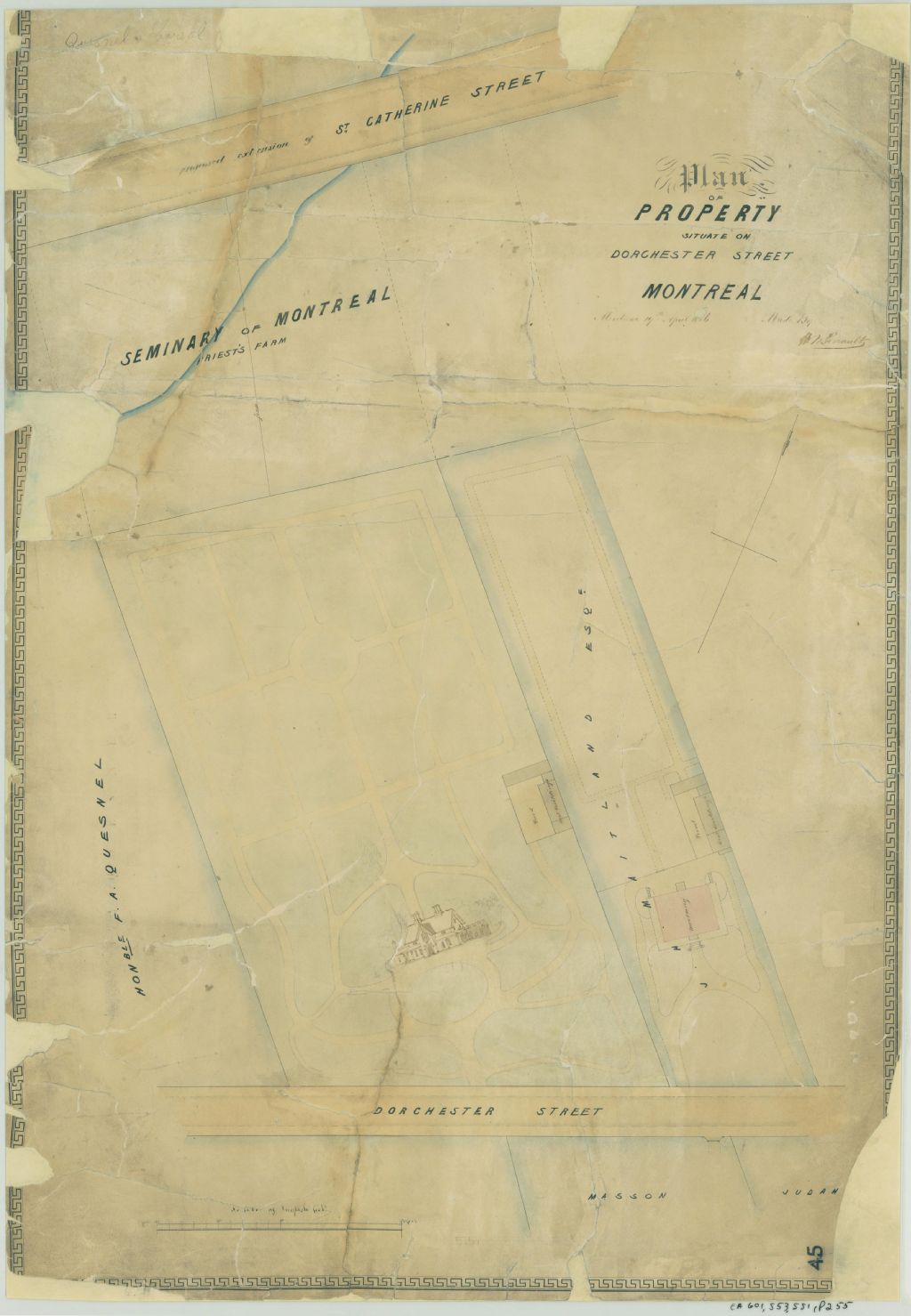 Ce plan présente le lot de monsieur F. A. Quesnel sur la rue Dorchester (devenue boulevard René-Lévesque) à Montréal. Ce sont les lots n° 1643 à 1650 du cadastre du quartier Saint-Antoine de la cité de Montréal. L'élévation de face de la résidence Quesnel est donnée. De plus un hangar et les jardins sont indiqués. La résidence du voisin, monsieur J. H. Maitland, avec son hangar et son jardin sont aussi localisés. Les autres voisins sont la ferme des Prêtres du Séminaire de Montréal, Henry Judah et Monsieur Masson