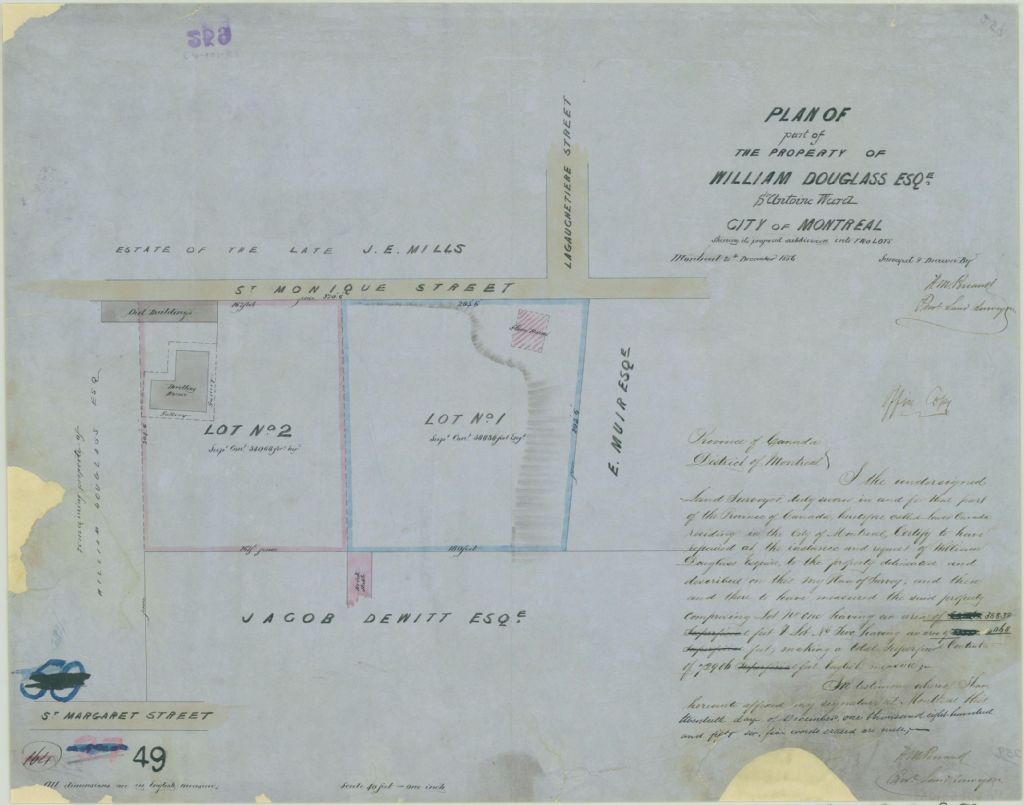 Plan of Part of the Property of William Douglas Esqe. St Antoine Ward City of Montreal Shewing its proposes subdivision into Two Lots