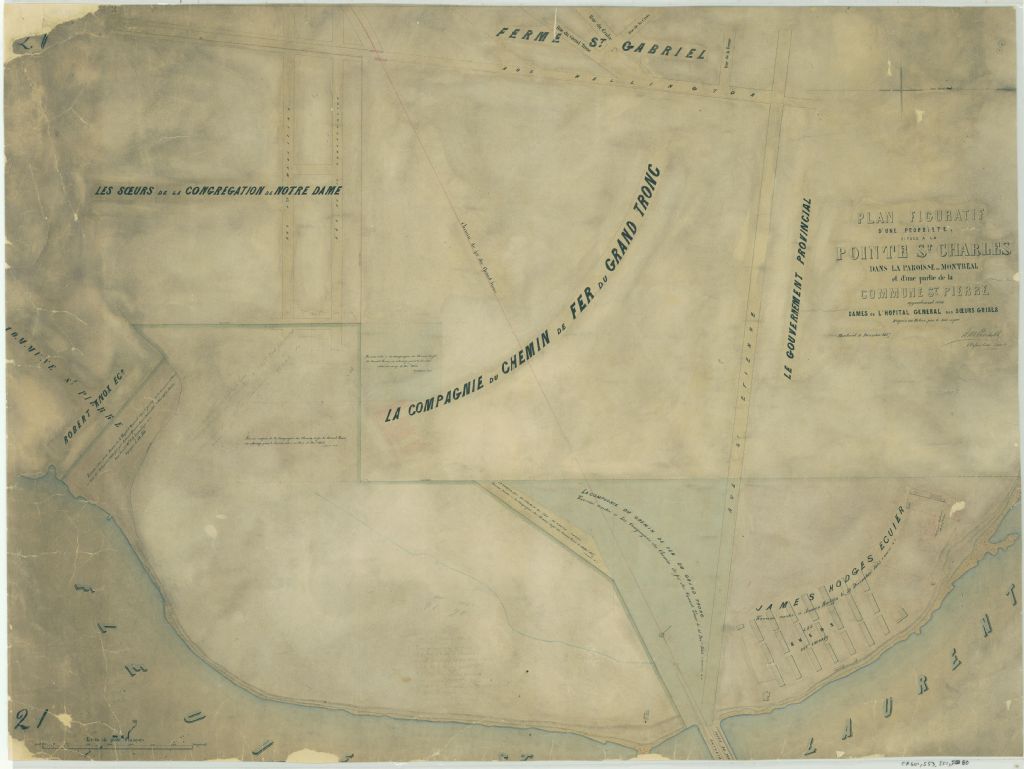 Ce plan représente une propriété de la Pointe Saint-Charles et de la commune Saint-Pierre sur l'île de Montréal. Ce sont les terrains appartenant aux Soeurs de la Congrégation Notre-Dame, à la compagnie de chemin de fer du Grand Tronc, au gouvernement provincial et à James Hodges.Ces terrains sont situés entre le fleuve Saint-Laurent, la rue Wellington et à l'est de la rue Saint-Étienne (devenue Bridge). Robert Knox possède aussi une partie de la commune Saint-Pierre. Près de la jetée du pont Victoria, il y a les terres de James Hodges sur lesquelles sont localisés les baraquements des immigrants, soit entre le fleuve et la rue Saint-Étienne (devenue Bridge). Le tracé de la ligne de chemin de fer du Grand Tronc, avec un observatoire près du pont Victoria, est indiqué. Des notes précisent les dates d'achat ou d'échange des terrains