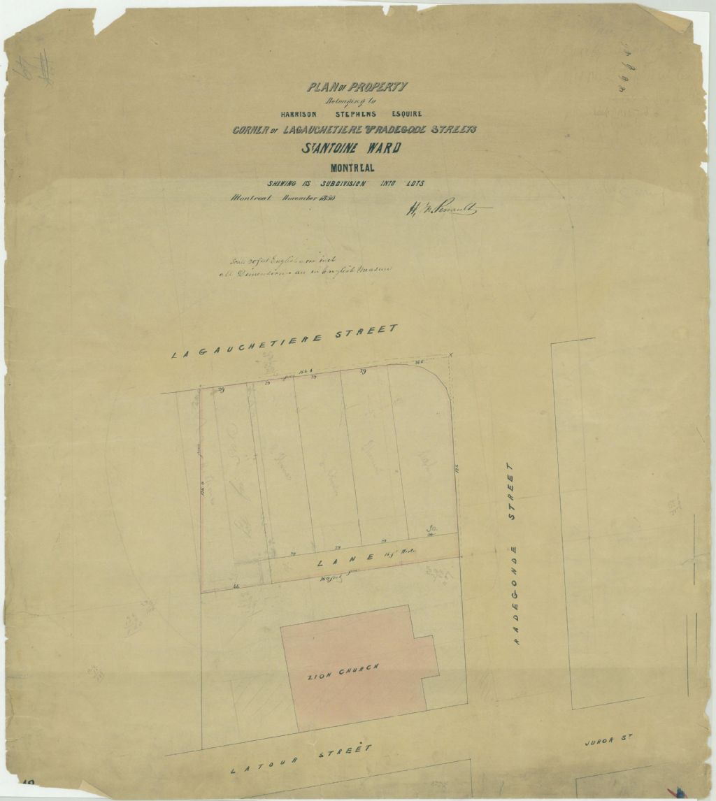 Ce plan présente la propriété appartenant à Harrison Stephens. Cette propriété est située à l'intersection des rues Lagauchetière et Radegonde (devenue Côte-du-Beaver-Hall) à Montréal. Il s'agit du lot n° 1090 du cadastre du quartier Saint-Antoine de la cité de Montréal.Le lot est subdivisé en lotissements. L'emplacement de l'église Zion est indiquée. Les mesures des lotissements sont indiquées