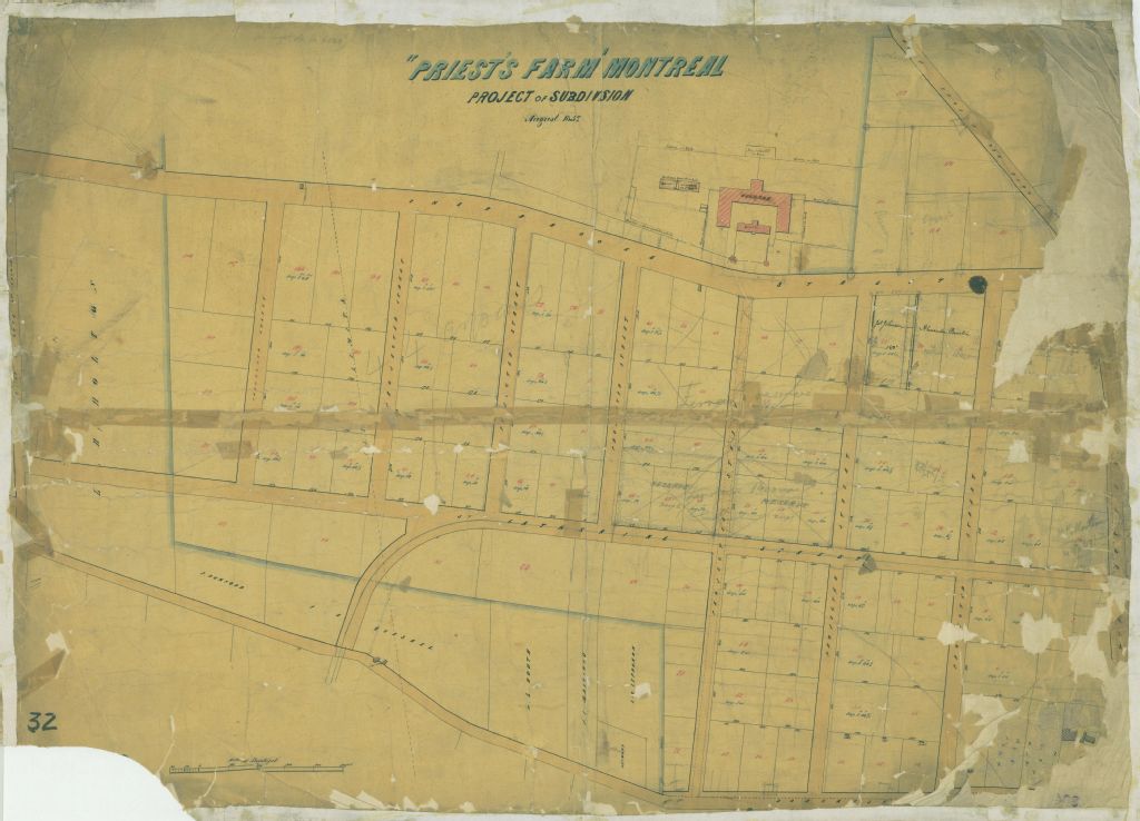 Ce plan présente la ferme des Prêtres située dans le quadrilatère formée par les rues Sherbrooke, Guy, Dorchester (devenue René-Lévesque) dans Montréal et Chemin de la Côte Saint-Antoine dans Westmount. Ce sont les lots n° 1 à 118 de l'ancien cadastre seigneurial du quartier Saint-Antoine ou n° 1592, 1622 à 1670 et 1720 du cadastre du quartier Saint-Antoine de la cité de Montréal.Le Collège de Montréal, la serre, les écuries en pierre couverts en bois, le hangar, la boutique, la maison des engagés et le jeu de balle au mur sont localisés. Une structure en pierre devant le Collège de Montréal est indiquée comme devant être bientôt démolie. Sept rues sont proposées entre Sherbrooke et Dorchester (devenue René-Lévesque). Sur le lot de Monsieur Quesnel, près de l'intersection de la rue Sainte-Catherine avec la rue Dorchester, se trouve une barrière à péage.Une maison est localisée à l'intersection des rues Dorchester et Guy. Une partie du [...]
