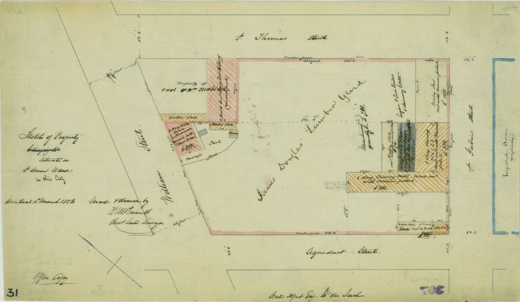 Ce plan présente le lot de James Douglas. Ce lot est situé dans le quadrilatère des rues Saint-Thomas, Saint-Gabriel (devenue Ottawa), Aqueduc et William à Montréal. C'est le lot n° 1386 du cadastre du quartier Sainte-Anne de la cité de Montréal. C'est la cour à bois de Monsieur Douglas. Sont localisés sur le plan un moulin à couper le bois, un moulin à dégauchir le bois, deux étables, deux remises en bois, un moteur, une bouilloire (chaudières) et une cheminée. Dans un coin du lot, à l'intersection des rues William et Saint-Thomas, il y a une distillerie avec une remise appartenant à William Molson, une maison de 4 logements avec une remise et une toilette extérieure. Les mesures et la valeur de chaque unité décrite sont indiquées
