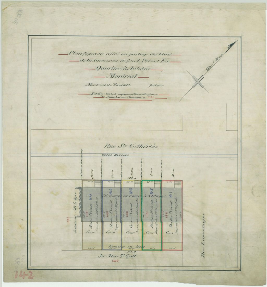 Ce plan présente le lot n° 1531 du cadastre du quartier Saint-Antoine de la cité de Montréal. Ce lot est situé à l'intersection des rues Sainte-Catherine et de la Montagne à Montréal. Le lot est subdivisé en 5 lotissements qui sont partagés entre Adèle, Hector, Oscar, Roméo et Berthe Prévost.Les voisins sont Sir Alex. Galt et Archibald Mc Intyre. Sont localisées sur les lotissements des maisons et des remises. Les mesures et les superficies des lotissements sont indiquées